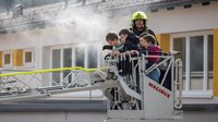 Jede der beteiligten Feuerwehren stellte einen Atemschutztrupp, da der Flur stark verraucht war. Die Übungsannahme sah vor, dass mehrere Klassen aus dem Gebäude gerettet werden mussten. Die Kinder der 1. Klassen wurden über eine Leiter aus dem Erdgeschoss ins Freie gebracht, während die 4. Klassen mithilfe der Drehleiter sicher evakuiert wurden - dies war sicher das absolute Highlight des Tages für die Schülerinnen und Schüler.